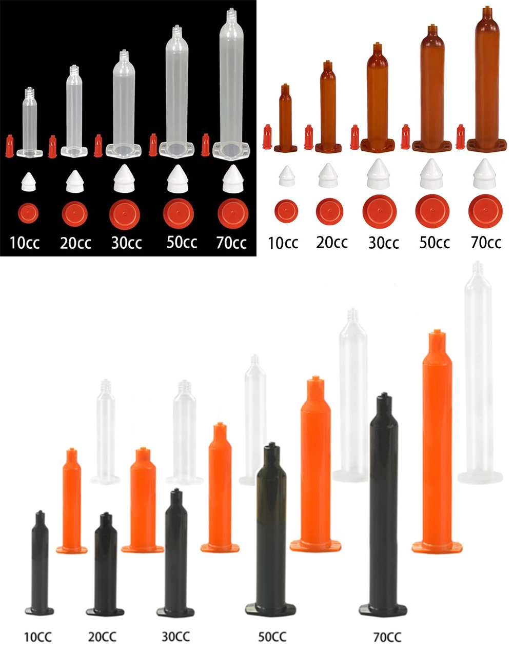 La seringue transparente convient à tous types de colles pour emballage électronique, colles conductrices, flux, colle rouge pour pastilles CMS, huile lubrifiante, peinture, etc. La seringue noire est adaptée aux colles UV, aux colles photopolymérisables et aux applications nécessitant une teinte foncée. La seringue ambrée convient aux applications générales de protection UV ; le stockage prolongé de colle UV est déconseillé. Matériau : PP
